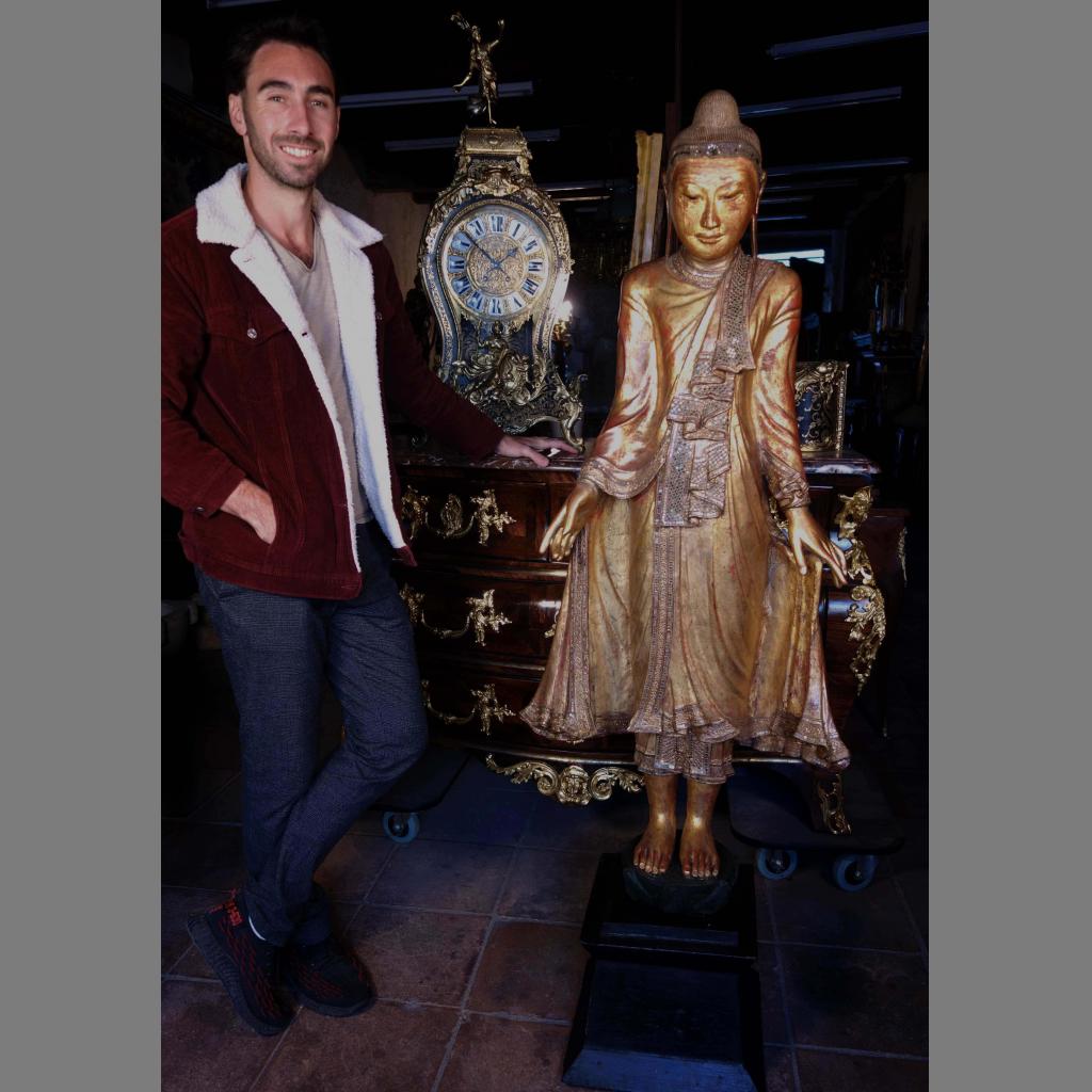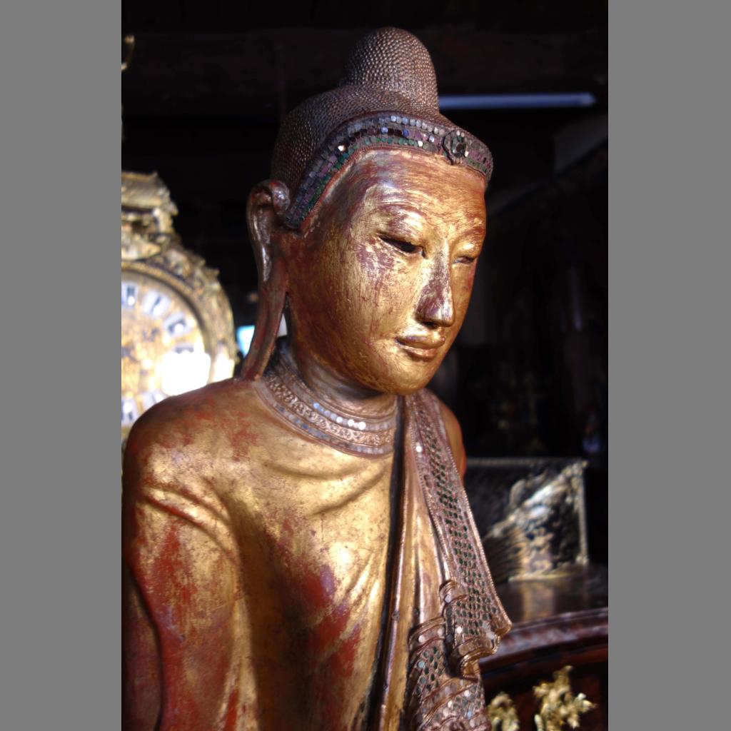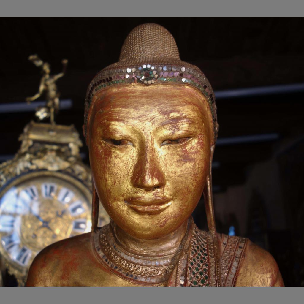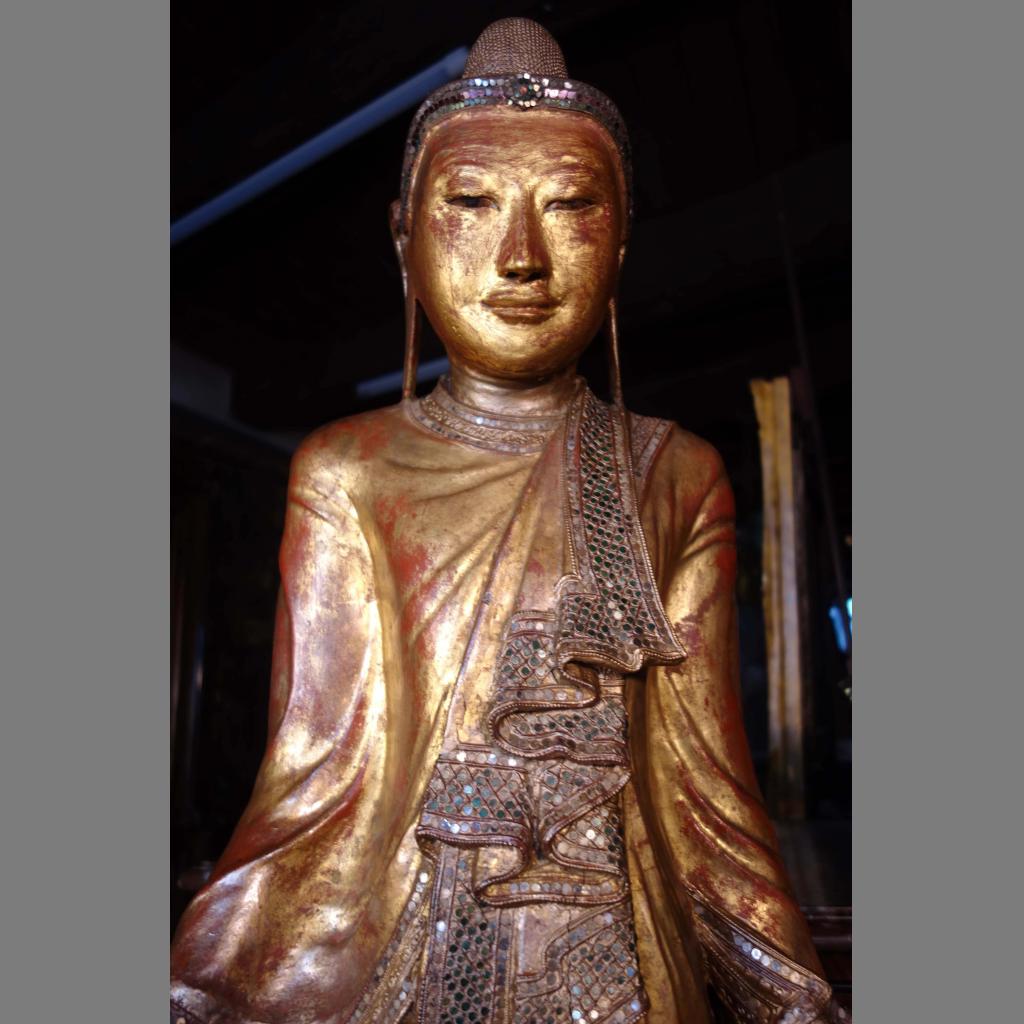 En bois sculpté doré, la tenue de l’Éveillé au visage calme et serein est agrémentée de nombreuses insertions de verre de différentes couleurs.
