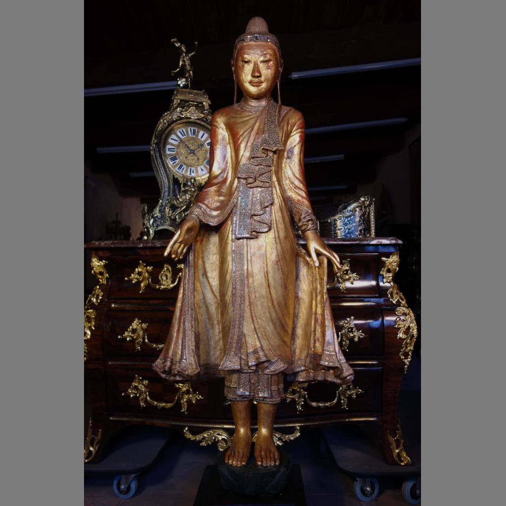 Reposant sur sa base lotiforme, le Bouddha debout est la représentation d’une action compatissante, la position des mains se rapproche du Varada-mudra qui symbolise le don et la générosité.