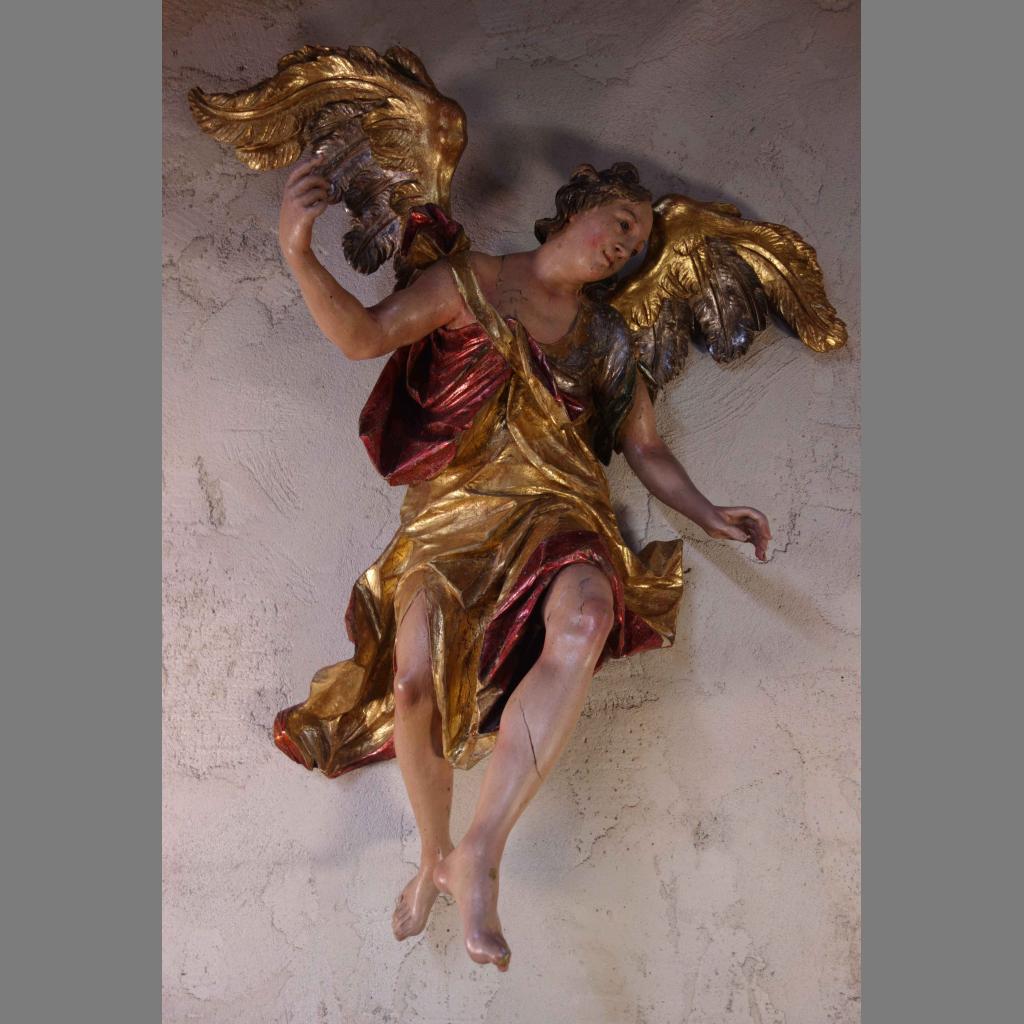 Grande statue de l’ange de l’Annonciation en bois richement polychrome et doré.