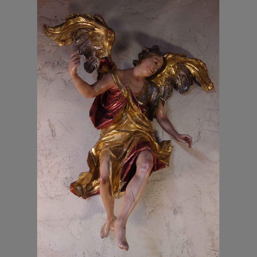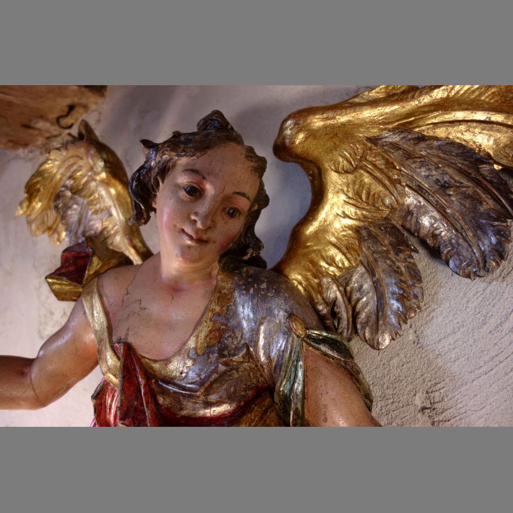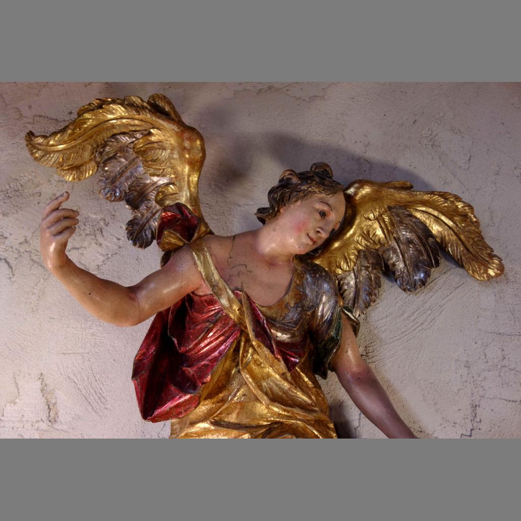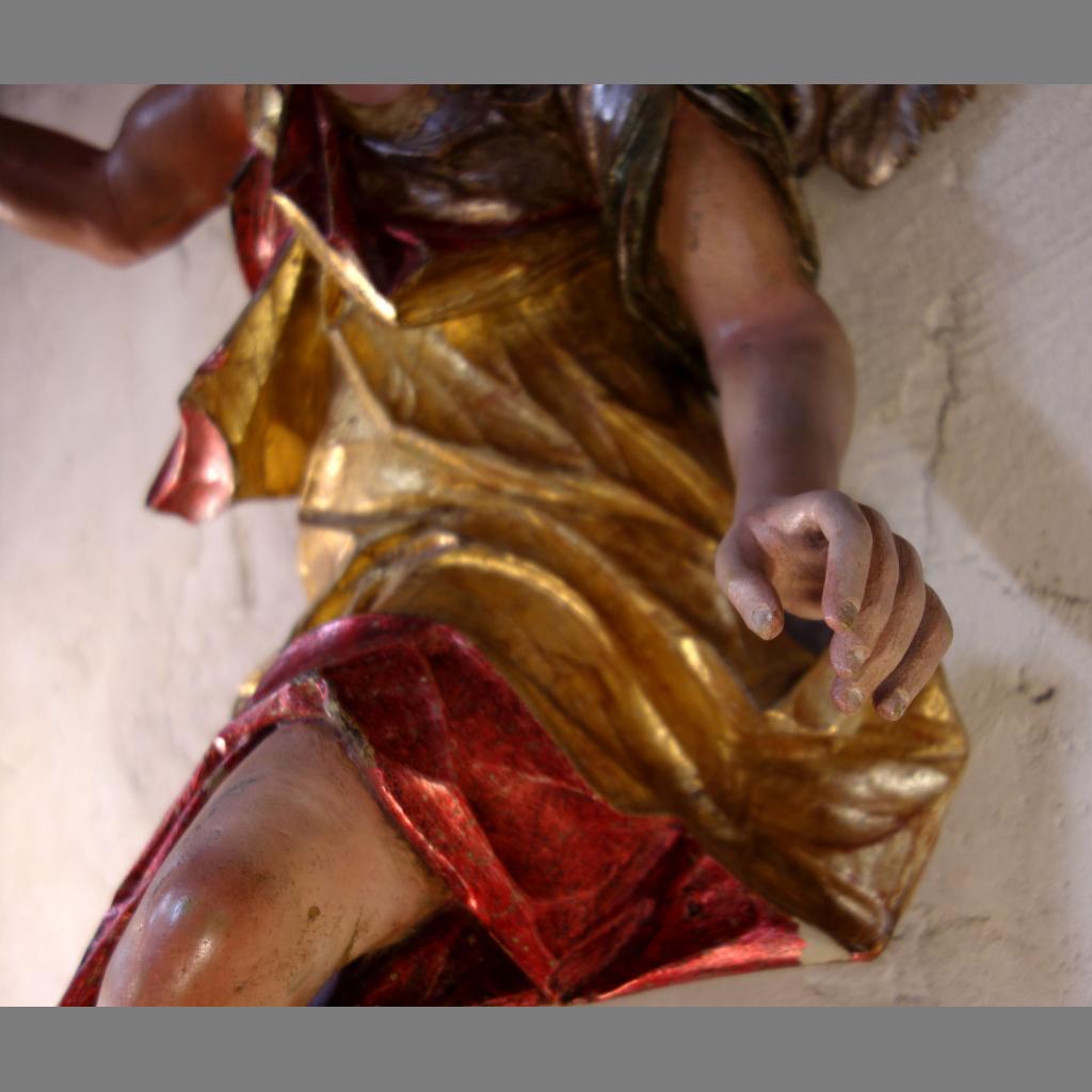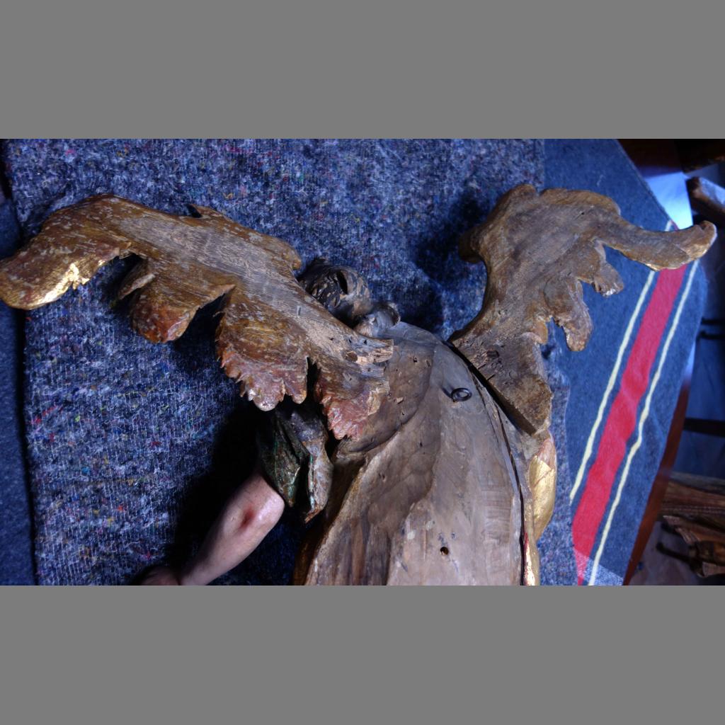 Un grand souci du détail apporté aux mains, aux pieds et aux grandes ailes déployés. Les couleurs dans un très bel état de conservation ont gardé leur éclat.