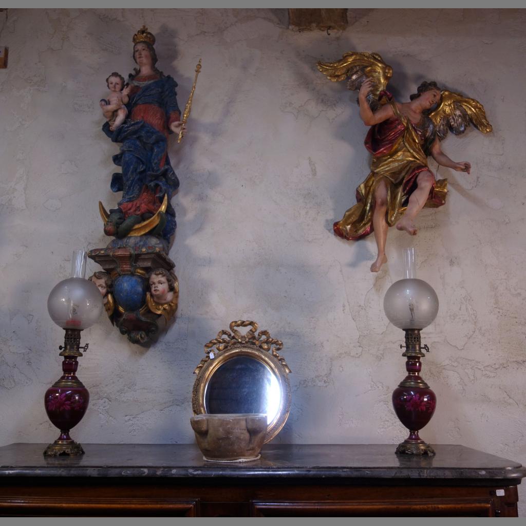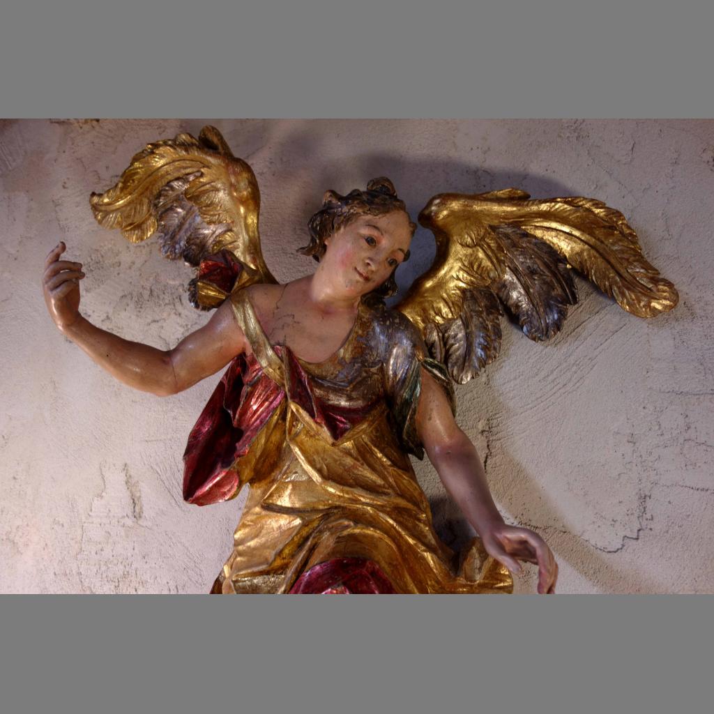 Grande statue de l’ange de l’Annonciation en bois richement polychrome et doré.